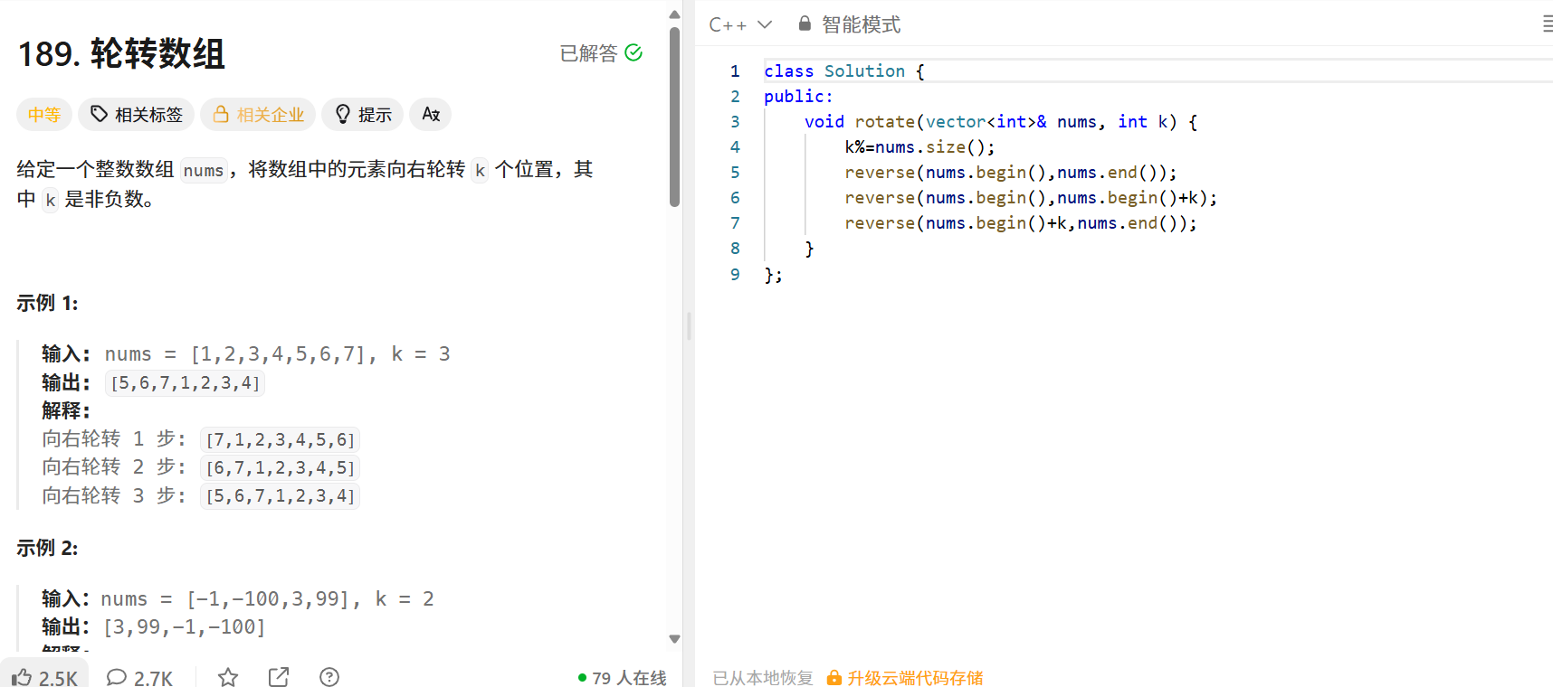 | 189. 轮转数组 | 三次反转法 | 1. 先对k取模(k≥数组长度时简化操作);2. 反转整个数组;3. 反转前k个元素;4. 反转剩余元素。通过反转操作的组合,实现元素的轮转效果。 | • 亮点:原地操作,时间复杂度O(n),空间复杂度O(1),避免额外数组开销;• 注意:k可能大于数组长度,必须先执行k %= nums.size(),否则会出现越界或无效操作。 |