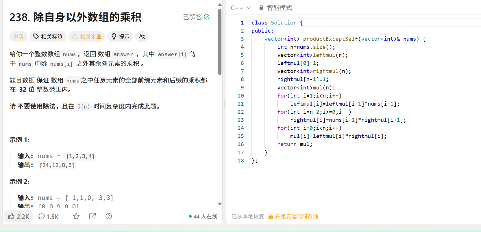 vector<int> left(n, 1); // left[i]:nums[0..i-1]的乘积