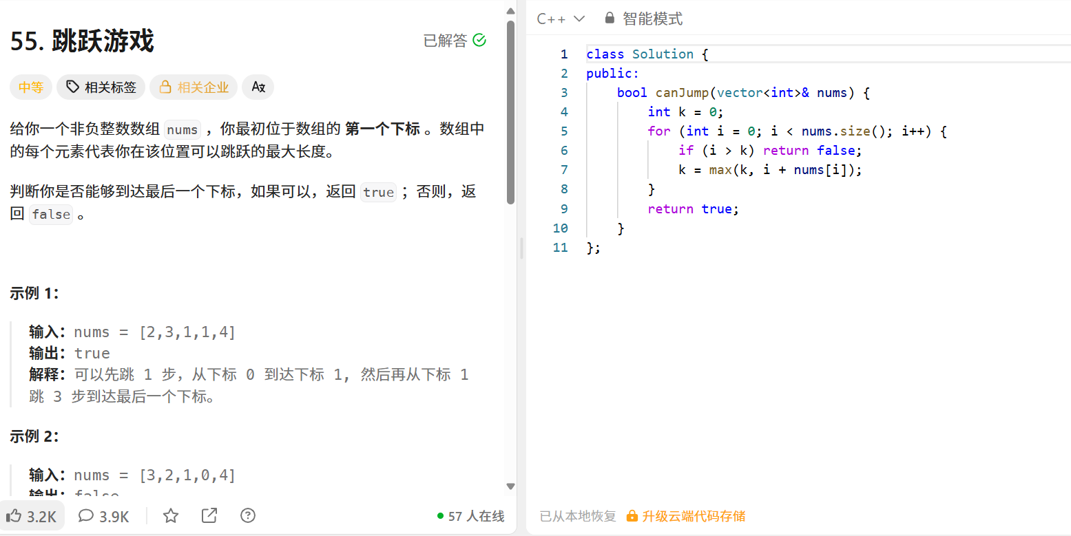 | 55. 跳跃游戏 | 贪心算法 | 1. 维护"当前能到达的最远位置"max_reach;2. 遍历数组,若当前索引超过max_reach,说明无法到达该位置,直接返回false;3. 否则更新max_reach为当前索引+当前元素值的最大值;4. 遍历结束后,若max_reach≥数组末尾索引,返回true。 | • 亮点:无需模拟跳跃过程,仅通过贪心策略维护最远可达位置,时间复杂度O(n),高效简洁;• 注意:初始max_reach为0,遍历从索引0开始,覆盖所有可能的跳跃起点。 |
