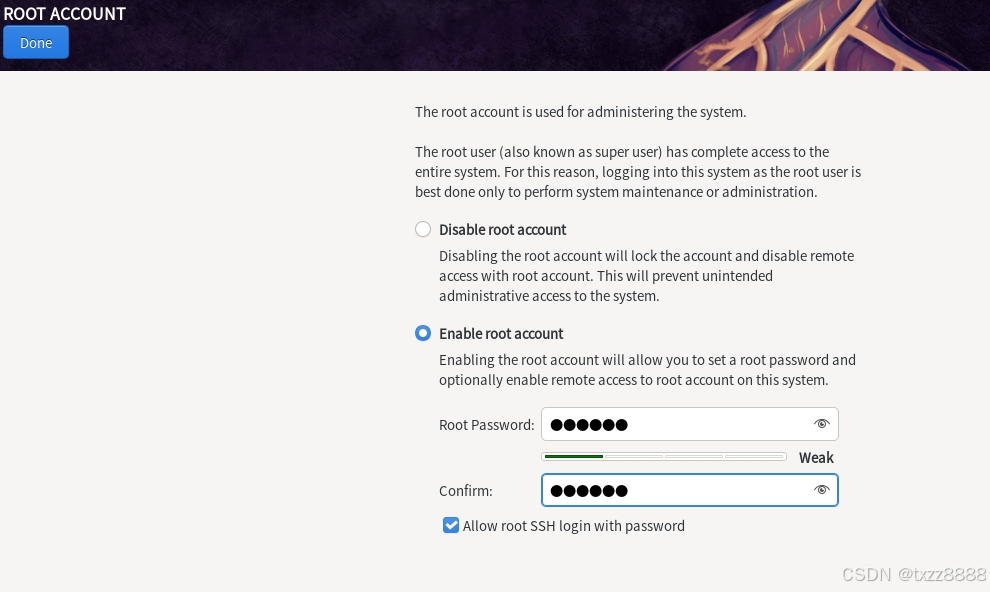 6.1.选择"Enable root account→勾选允许root ssh→Done"。