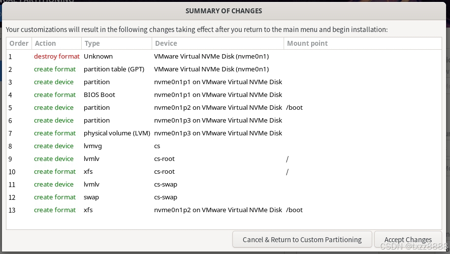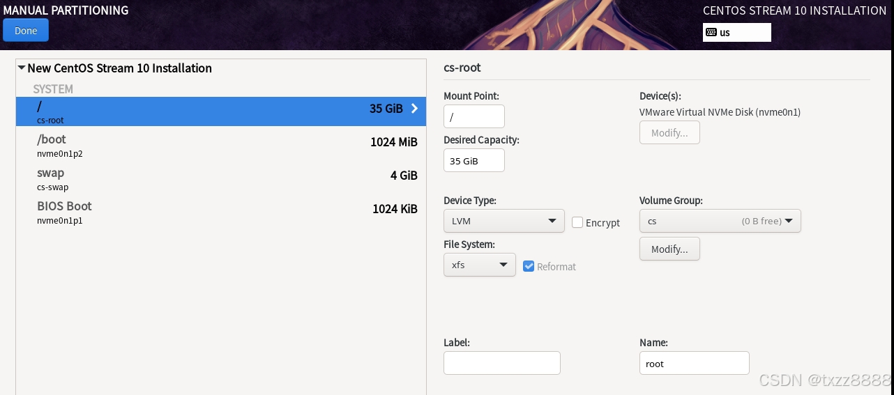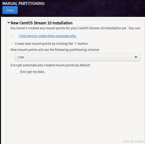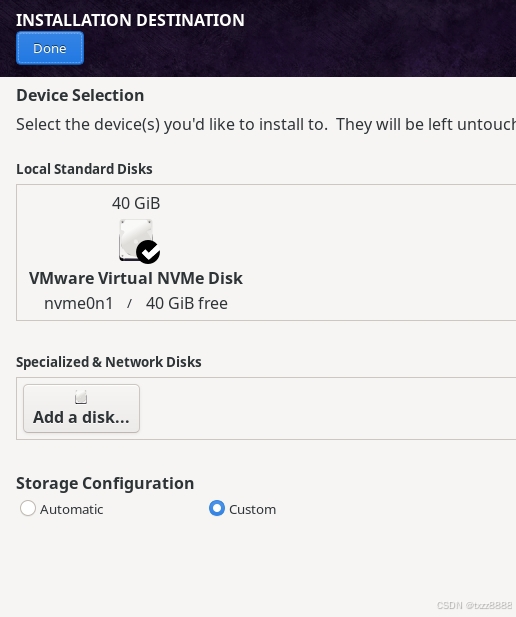 3.1.1.选择"Storage Configuration→Custom→Done",手动分配分区。