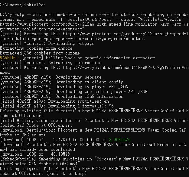 视频合成字幕:yt-dlp --cookies-from-browser chrome --write-auto-sub --sub-lang en --sub-format srt --embed-subs --yes-playlist -f "best[ext=mp4]/best" --output "OCP_Summit_Videos/%(title)s.%(ext)s" "https://www.youtube.com/playlist?list=PLAG-eekRQBSivcqzLQLnBtGpplX_4zvYm"