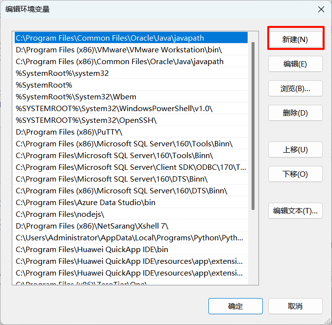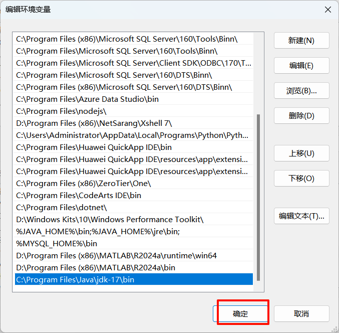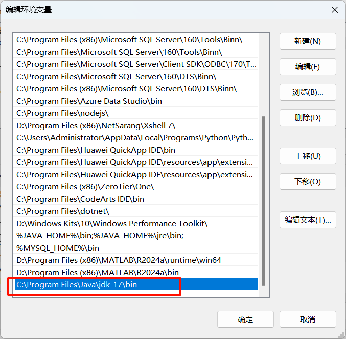 在"环境变量"窗口找到系统变量下的"Path",选中后点击"编辑",然后点击"新建"并添加JDK的bin目录路径(与安装时的路径要一致)。