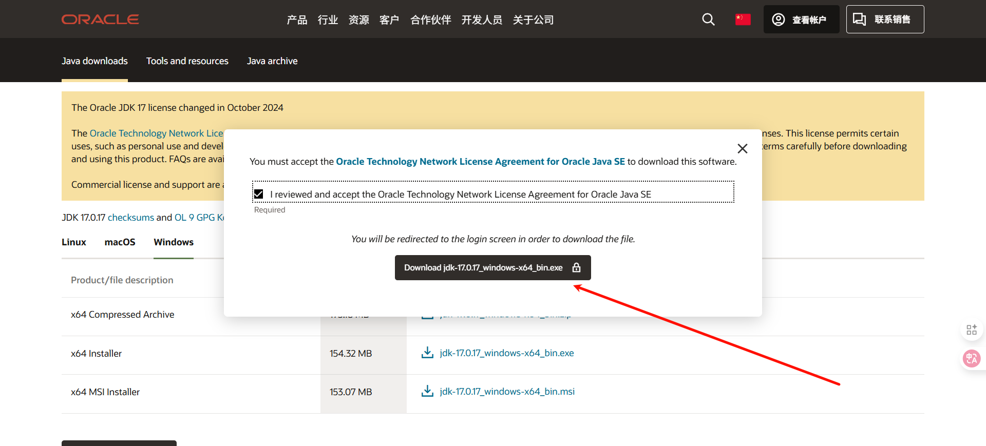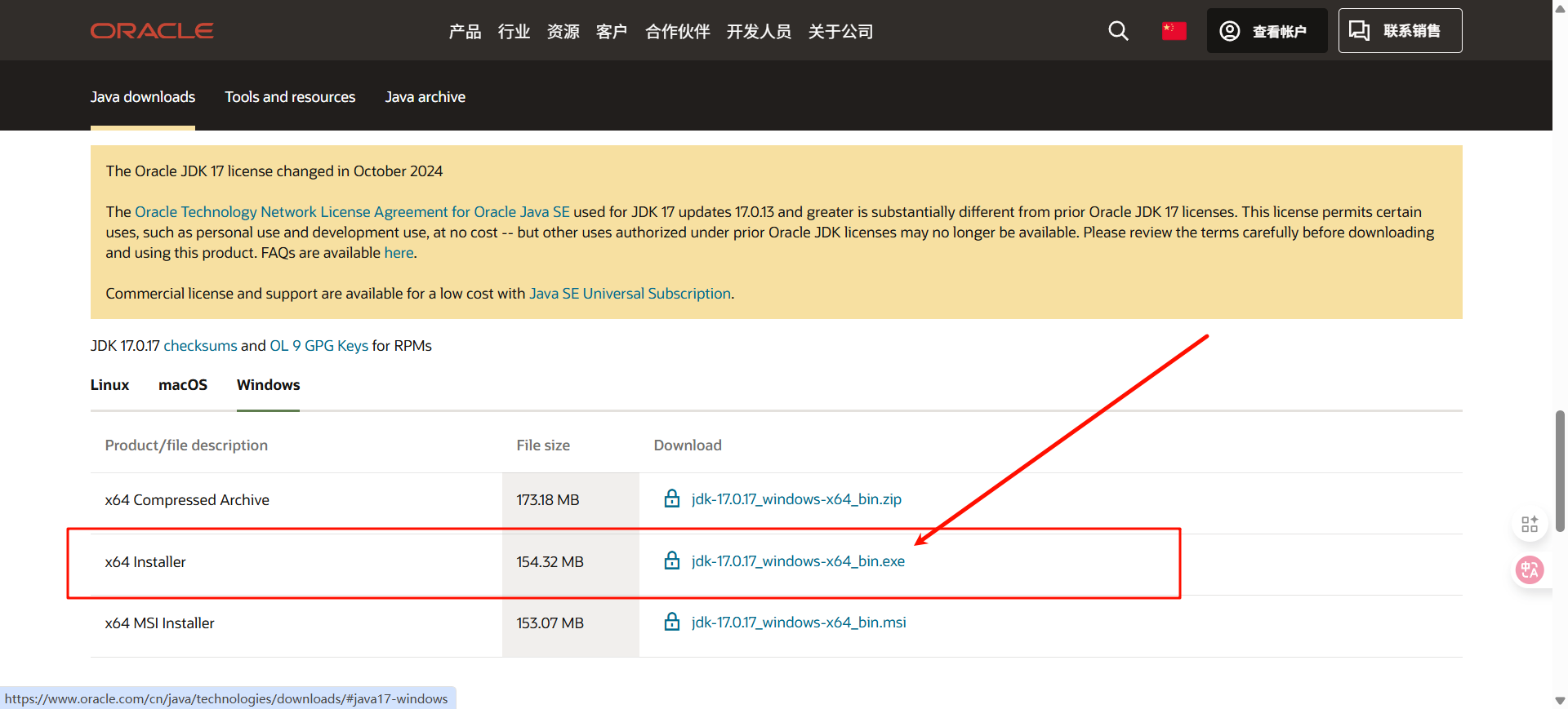 进入到Oracle JDK下载页面下载最新版本的JDK,本文下载的是Java 17,在下载页面选择适合你的操作系统版本进行下载。