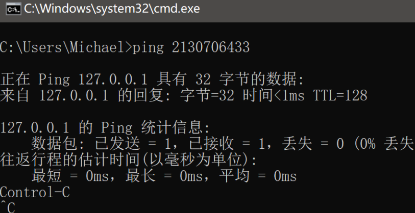 2130706433、八进制017700000001、十六进制0x7f000001;