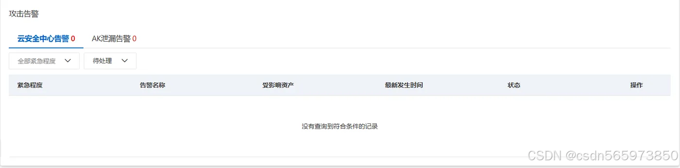 如果你想要升级云安全中心的功能版本的话,你可以在 云安全中心购买页 选择购买即可。这里的攻击告警,主要会展示两方面内容:【云安全中心告警】、【AK泄露告警】