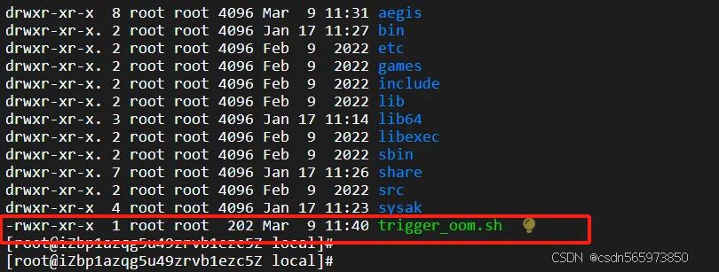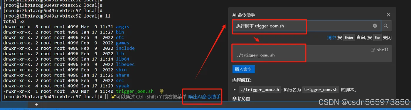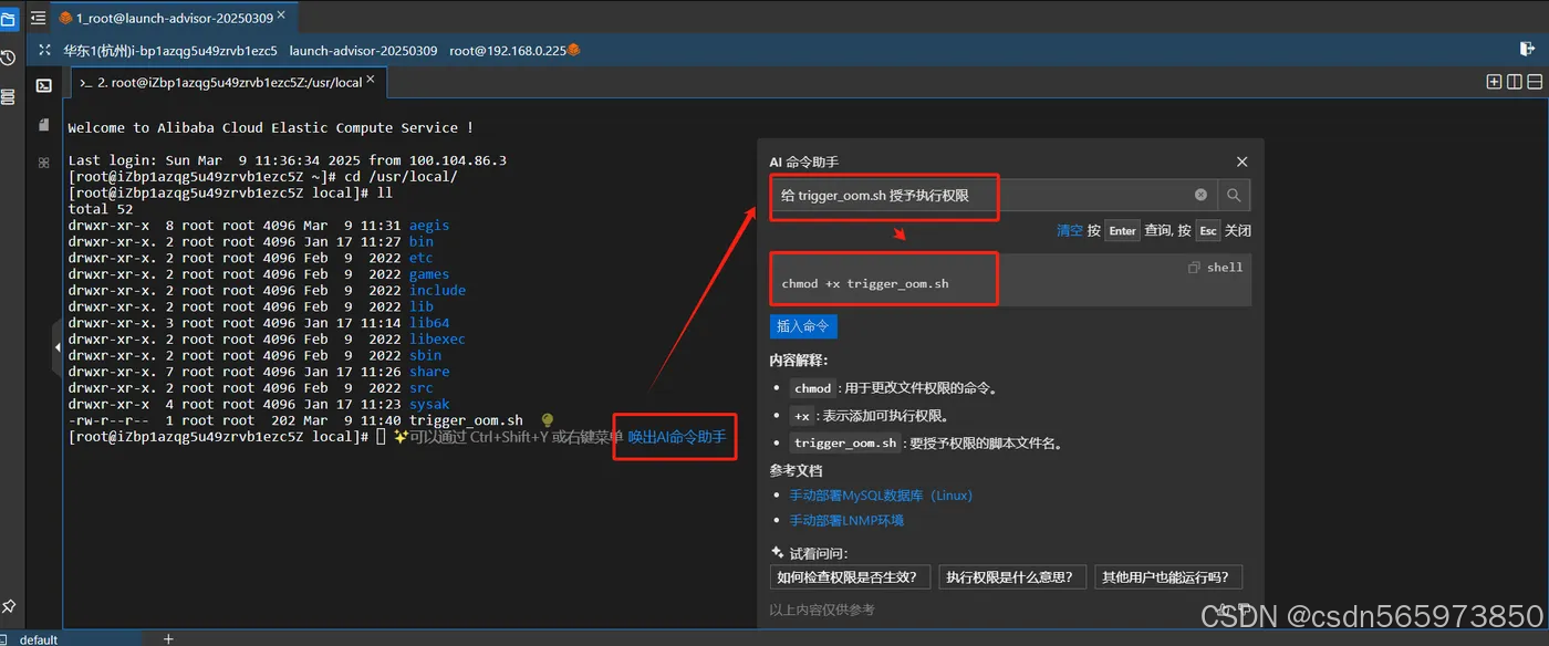 上传成功后,回到 ECS 命令行页面,进入到 /usr/local/ 目录下,点击【唤出 AI 命令助手】输入我们的需求,需要给trigger_oom.sh 授予执行权限,输入命令【给 trigger_oom.sh 授予执行权限】,可以看到AI命令助手已经为我们生成了命令