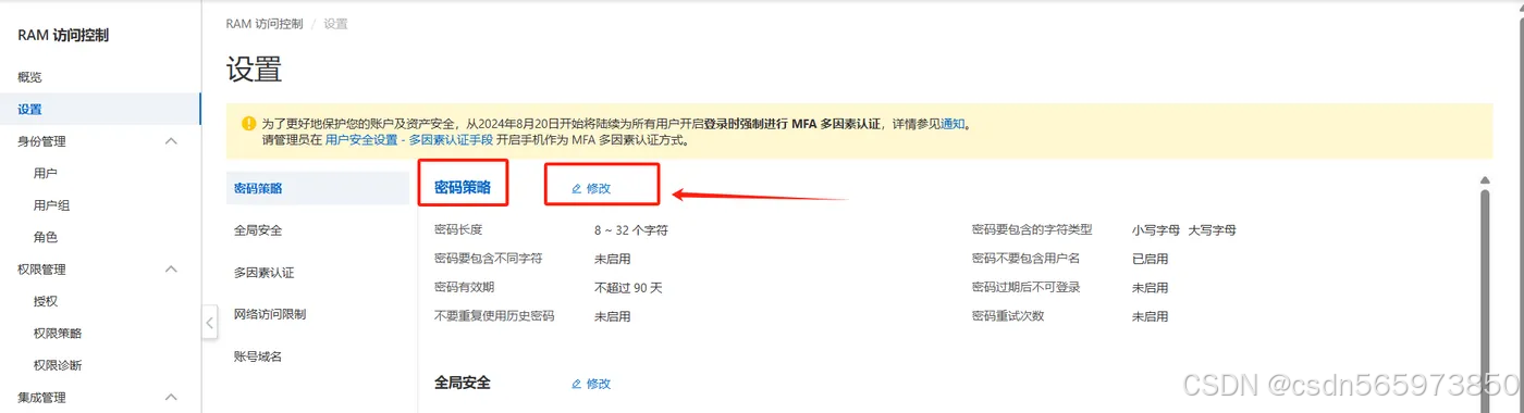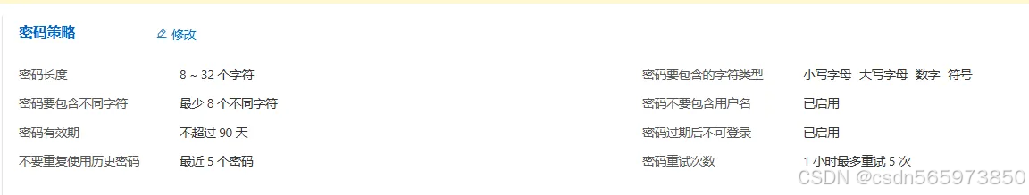 点击【文档链接】按照文档中的描述,登录RAM控制台,在设置页面的密码策略区域,单击修改,设置密码规则参数