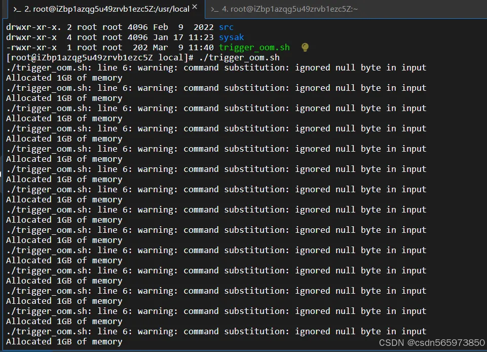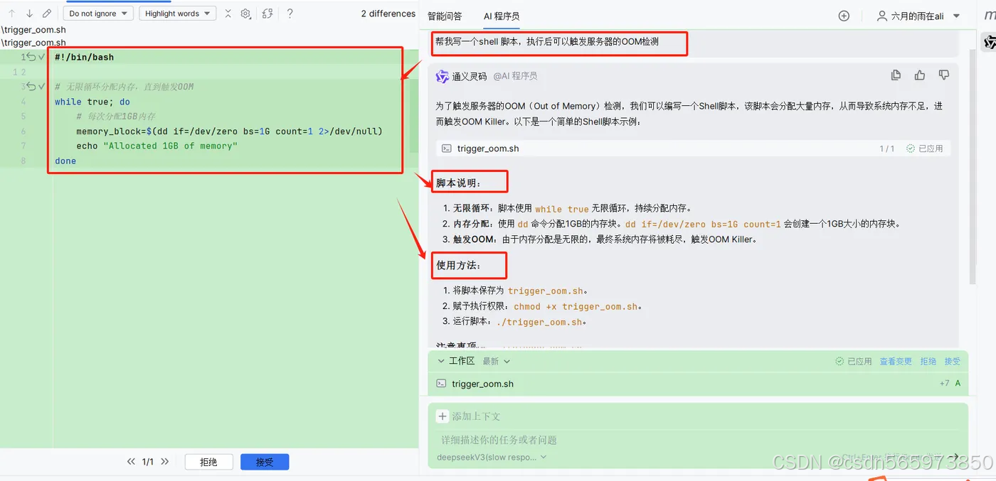 这里由于我的云服务器没有检测到漏洞,那么这里我让通义灵码 AI 程序员 帮我写一个制造OOM漏洞的脚本,在idea 开发工具中输入如下内容:【帮我写一个shell 脚本,执行后可以触发服务器的OOM检测】同时可以看到如下的脚本内容、脚本说明、使用方法