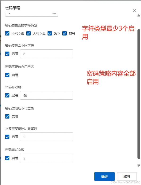 在密码策略修改页面,启用全部的密码策略内容,点击确定后完成密码策略的设置
