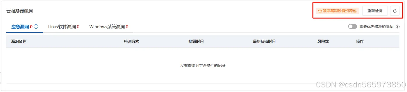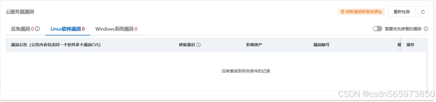 但是我回到安全管控的【云服务漏洞】,点击【重新检测】尝试刷新,重新检测了几次,也没有看到具体的 Linux 漏洞信息,不太清除是因为什么原因导致实际Linux 服务器的内存已经被大量占用,但是这里没有检测出来