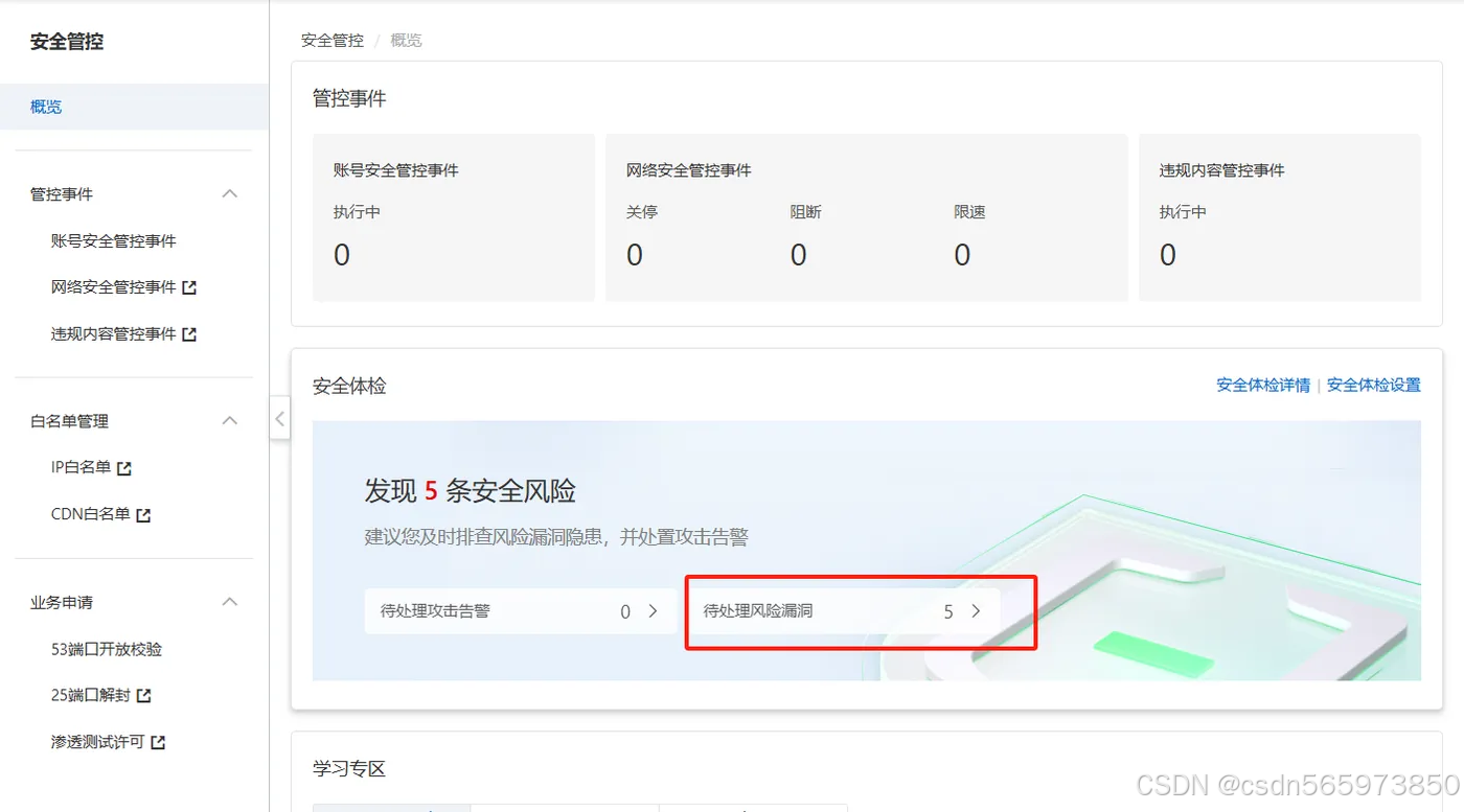 登录阿里云官网,进入安全管控控制台 如果没有开启安全体检,需要先开通安全体检服务,这里需要说明一下,安全体检为您提供免费的基础安全检测 ,所以开通服务是不用担心收费的,基础版安全检测。我的已经开通过,这里开通之后的安全体检概览页面如图
