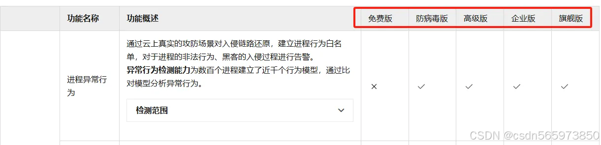 攻击告警主要支持检测服务器中的攻击告警事件,覆盖网站后门、异常登录、恶意软件等攻击告警类型,分为不同的版本,不同版本对于攻击告警的场景支持是不同的,默认的是免费版,支持检测的场景较少。详细的内容可以查看云安全中心功能特性,