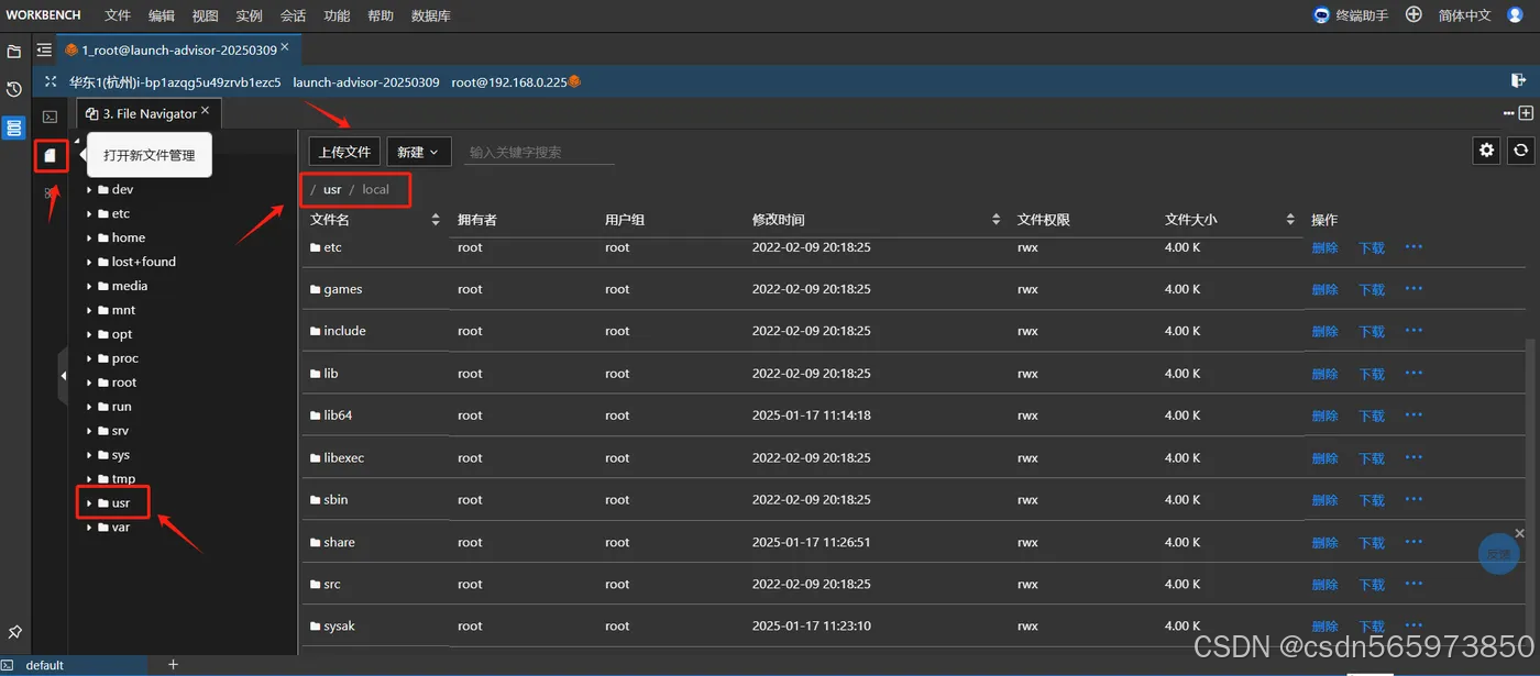 输入密码后登录Linux 服务器,选择服务器的文件管理器,上传 脚本文件 trigger_oom.sh 到 /usr/local/ 目录下