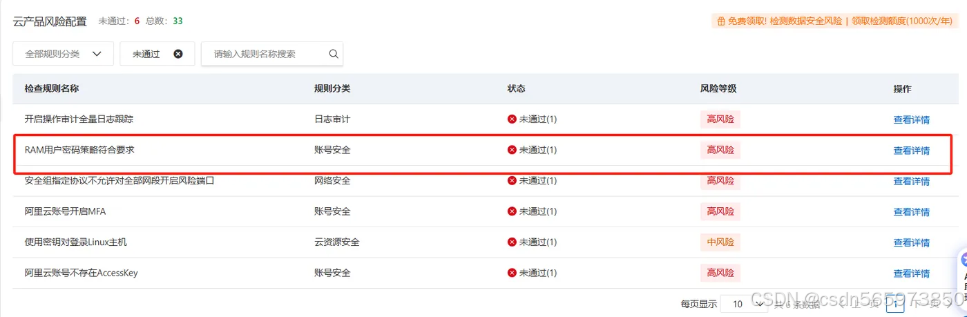 这里我有个疑问,就是说我已经修复了【RAM用户密码策略符合要求】,但是回到云产品风险配置,这里还在,也没有【重新检测】按钮,这里没办法验证自己的修复是不是真的满足安全体检的要求,但是已经是按照文档的要求进行了修复,应该是没有问题了