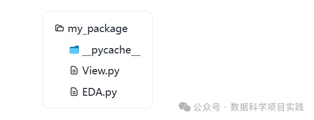 尝试自己创建一个名为 my_package 模块,该模块中存放一些自定义的数据分析函数,可以重复调用。如下图在当前目录下,创建一个名为 my_package 的文件夹,在该文件夹下面创建一个名为 __pycache__ 的子文件夹;然后创建两个 python 模块(View.py,DEA.py);接着在这两个模块中定义函数。