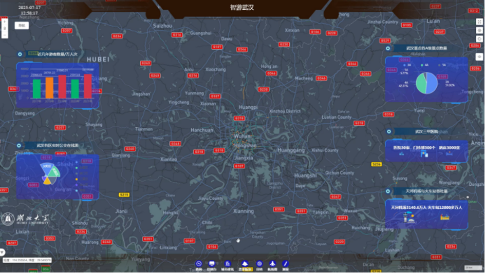 随着智慧城市和数字文旅的快速发展,传统的旅游资源管理和信息发布方式已难以满足现代城市精细化管理和游客多样化需求。武汉作为中部地区重要的旅游城市,拥有丰富的自然与人文景观、完善的交通网络和多样的配套服务,如何将这些资源以直观、动态、交互的方式呈现出来,成为提升城市形象、优化旅游服务、辅助科学决策的重要课题。