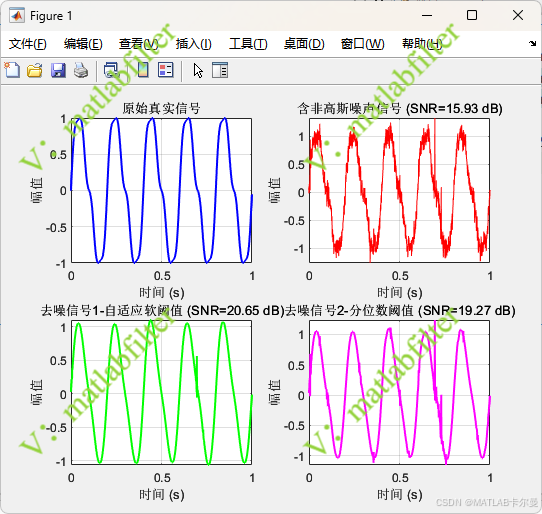 本文所述的例程构建了包含多频率的真实测试信号,并在其上叠加拉普拉斯噪声、脉冲噪声与高斯噪声的混合非高斯扰动,用于验证小波变换在复杂噪声环境下的去噪性能。程序首先对含噪信号进行多层小波分解,获得每一层的近似系数与细节系数,然后分别实现两类针对非高斯噪声的阈值化处理方法
