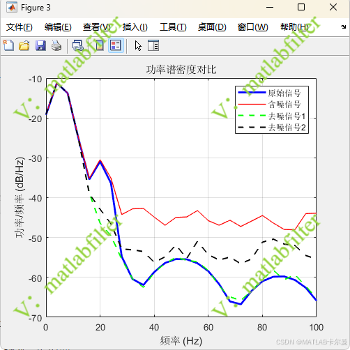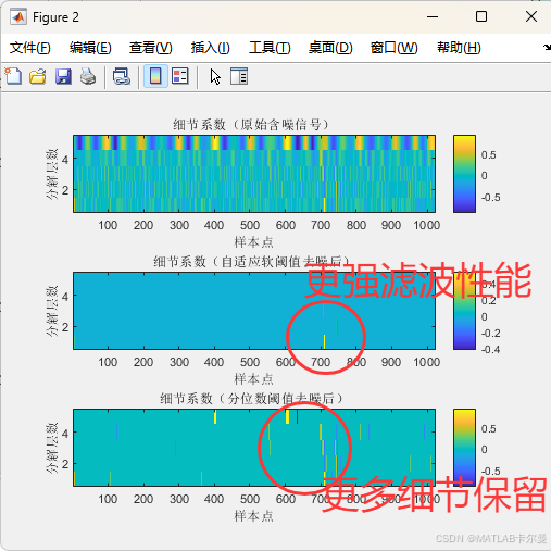 通过两种阈值方法的对比,可观察小波变化去噪在混合非高斯噪声环境下的鲁棒去噪效果。程序还绘制了时域波形、细节系数图及功率谱密度对比,为工程应用提供直观结果。