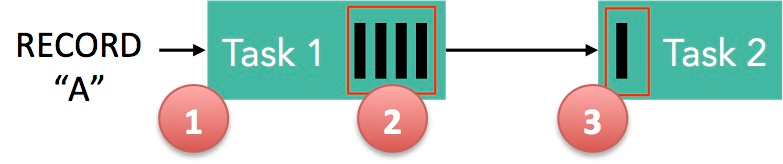 上图是一个数据传输的简图。当 Task1 有 Buffer 空间时,记录 A 被序列化并写入 LocalBufferPool 中,接着发送到 Task2 的 LocalBufferPool 中,Task2 读取并反序列化后交由程序处理。