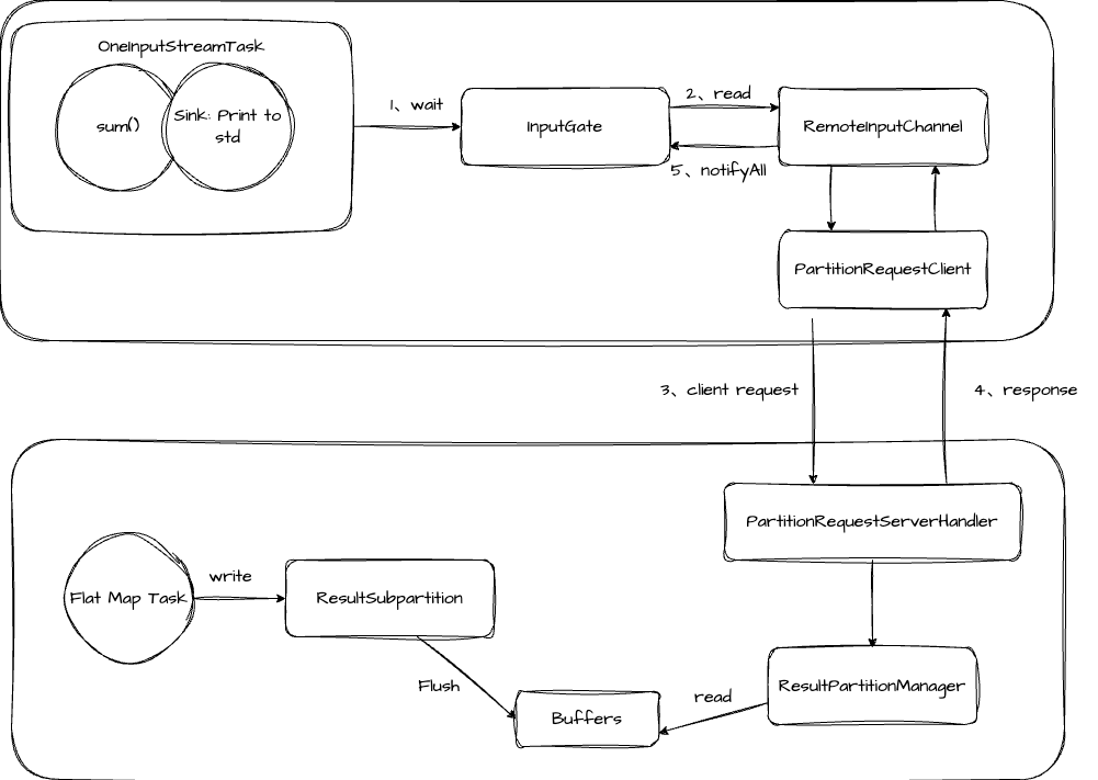 从图中可以看到,当 sum 所在线程没有 Buffer 可以消费时,会通过 PartitionRequestClient 向 Flat Map Task 所在的进程发送请求。Flat Map Task 所在进程接收到请求后,会读取 Buffer 中的数据并返回。