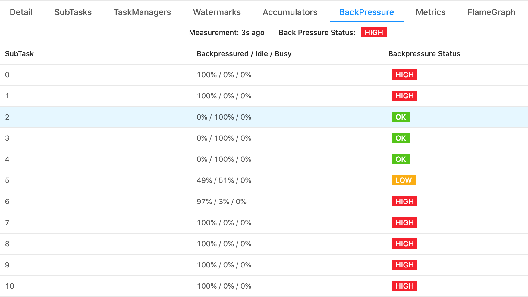 - LOW: 10% < 反压比例 <= 50%,这种状态需要关注。