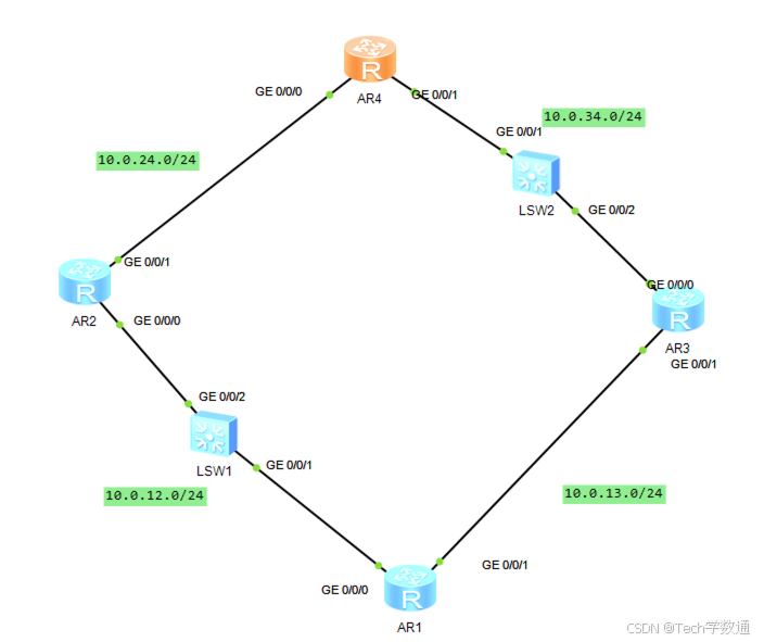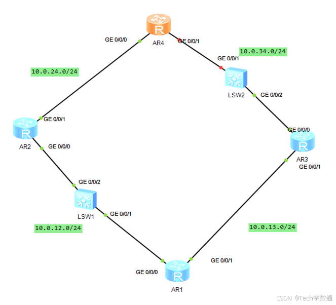 [R1]ip route-static 10.0.34.0 255.255.255.0 10.0.13.3#第二条路线回程