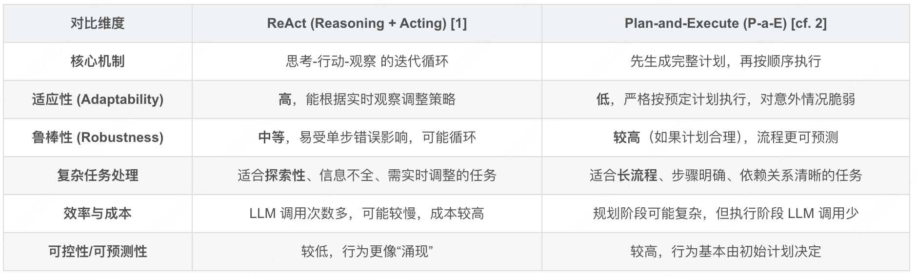 ReAct 通过迭代的"思考-行动-观察"循环赋予了 Agent 灵活性和适应性,而 Plan-and-Execute 则通过"先规划后执行"的模式提供了更高的结构性和可预测性。