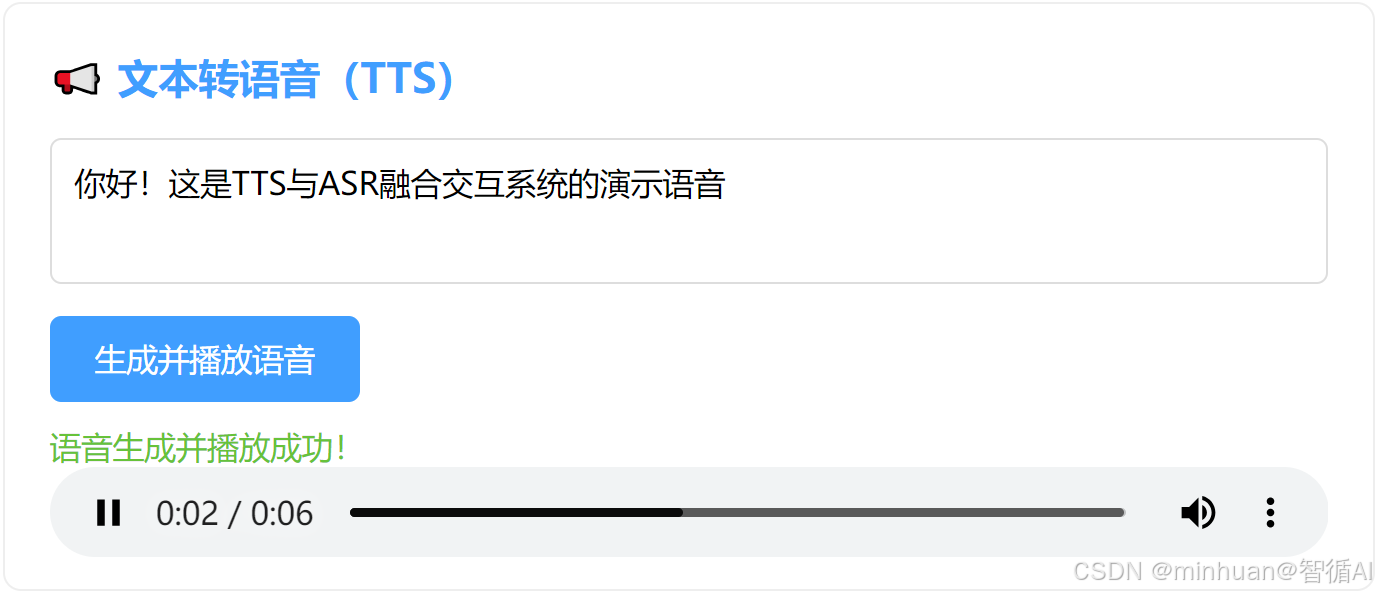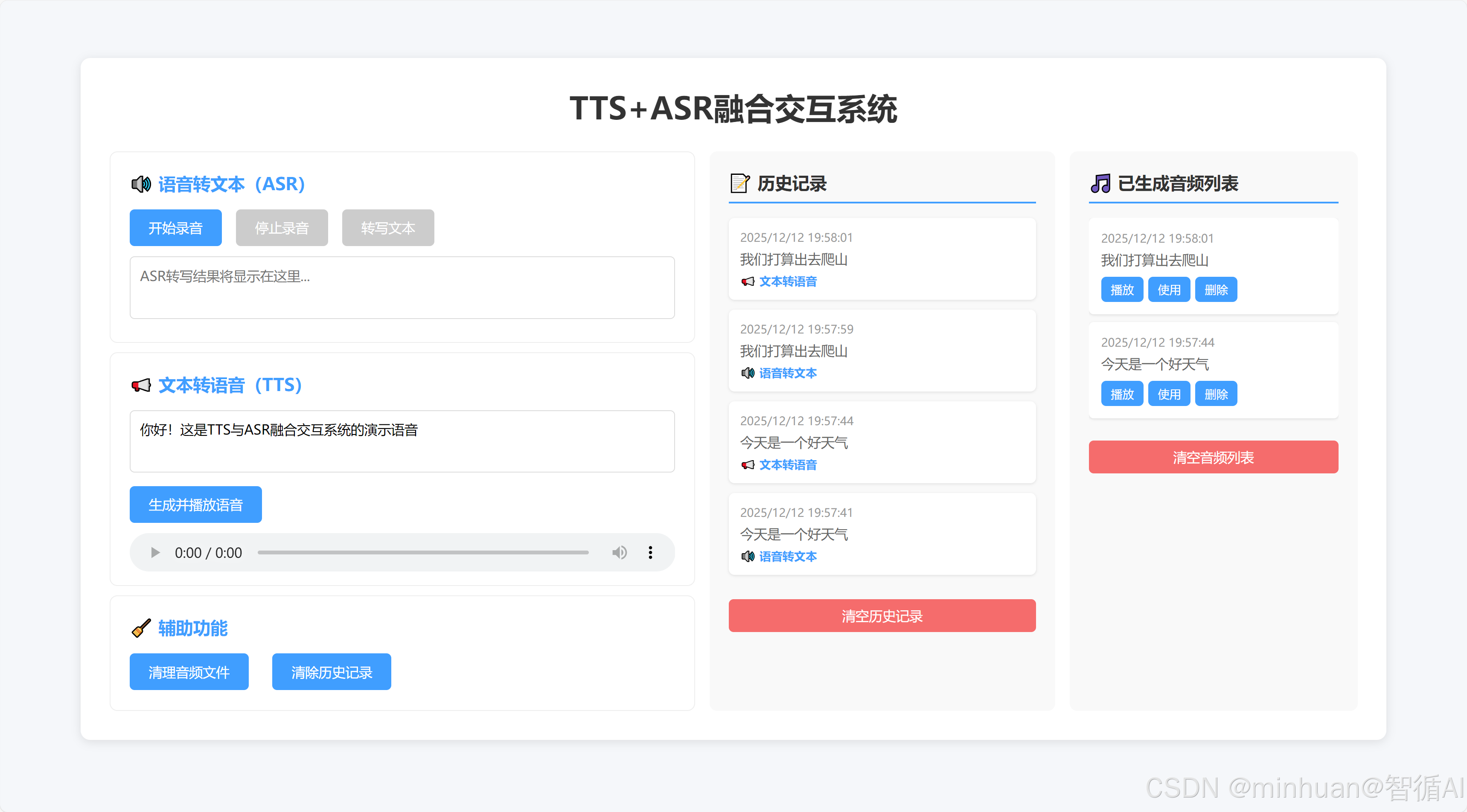 在日常开发中,很多人对语音技术的认知还停留在单向转换,即用 ASR 做语音转文字,用 TTS 做文本转语音,却忽略了两者融合后的闭环价值。实际上,从智能客服、实时翻译到无障碍工具、车载语音,所有成熟的语音交互场景,核心都是 "ASR 接收输入→文本处理→TTS 反馈输出" 的完整链路。今天我们整合零散的理论基础,从基础概念入手,先搭建一套 "前端可视化 + 后端轻量 API" 的 TTS+ASR 融合交互系统,不仅实现 "语音→文本→语音" 的平滑切换,还对每一个环节的底层逻辑,做一些重点分析。