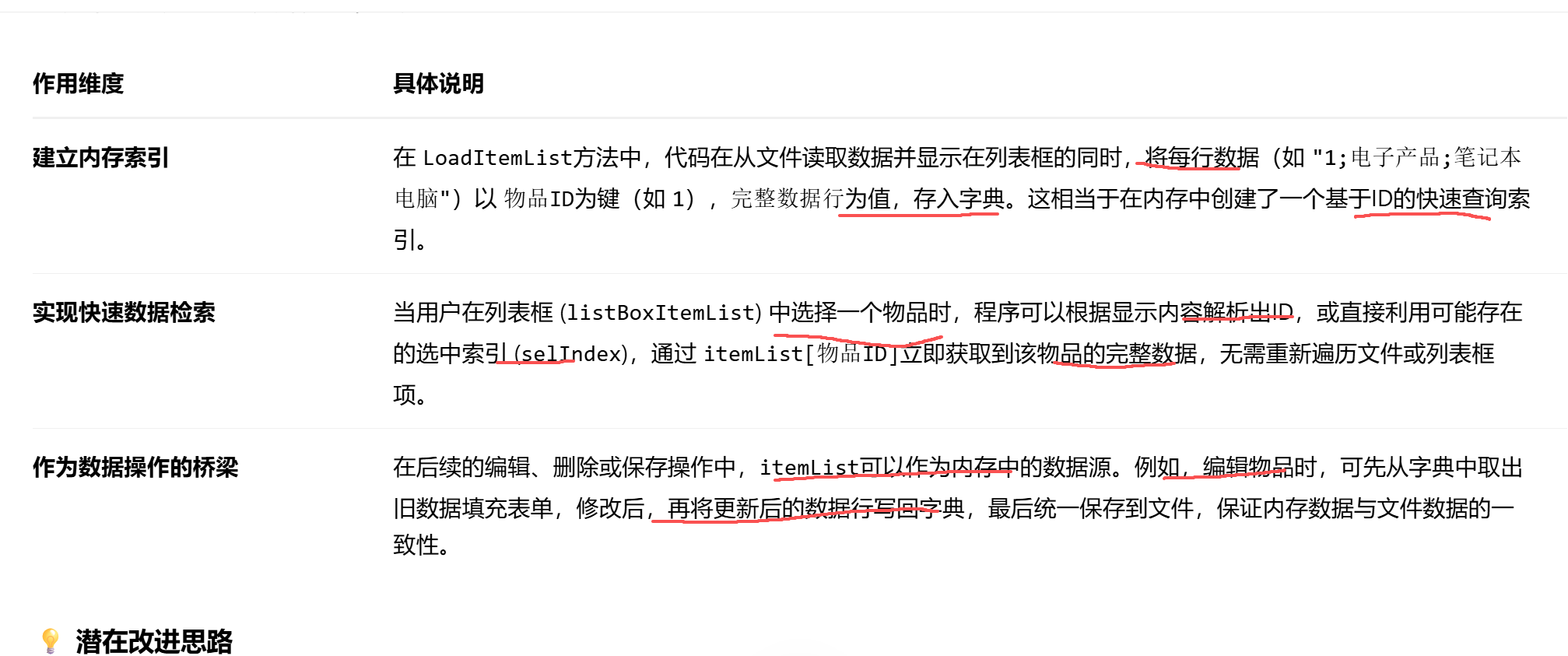 在您提供的代码中,itemList这个 Dictionary<int, string>对象扮演着数据缓存和快速查找器的关键角色。它的主要作用是建立物品ID与完整数据记录之间的映射关系,以便高效地进行数据管理。