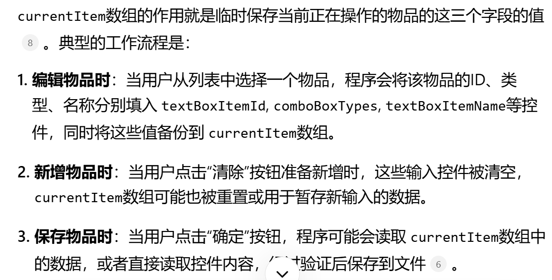 string[] currentItem = new string[3];这行代码的作用是创建一个字符串数组,用于临时存储当前正在操作(新增或编辑)的物品信息。