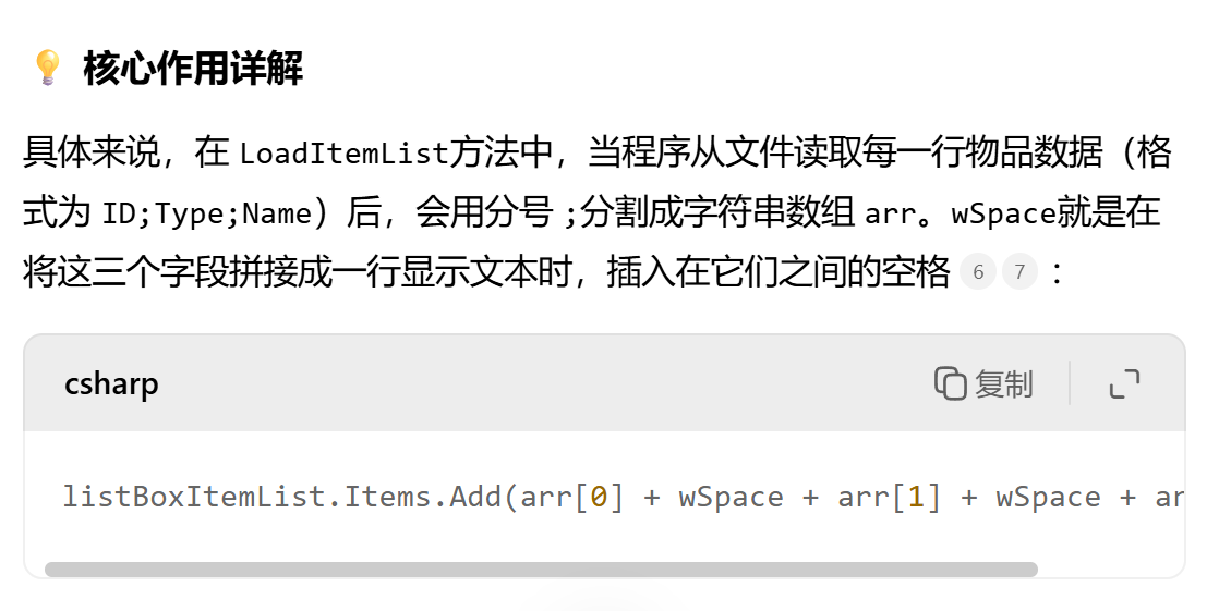 wSpace(空格):就是个小隔板(一个空格),为了让显示在列表里的物品信息(如"1 电子产品 笔记本电脑")看起来更整齐,用空格把ID、类型、名称分开。