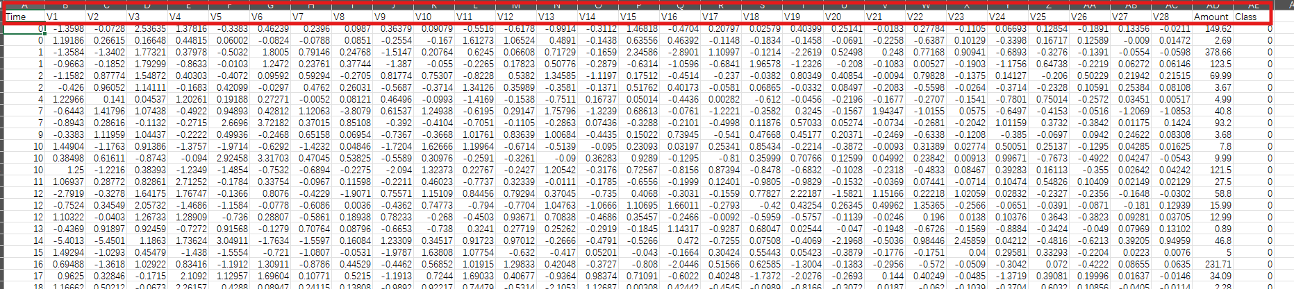 另外我们这里的数据是经过z标准化处理过的,由数值有正有负可以看出,其中有Amount列没有标准化,Time是用户登记的时间,一般银行进行业务的窗口不止有一个,所以时间有一样的,这里Time并没有什么用,前面都是数据,最后target就是最后结果。