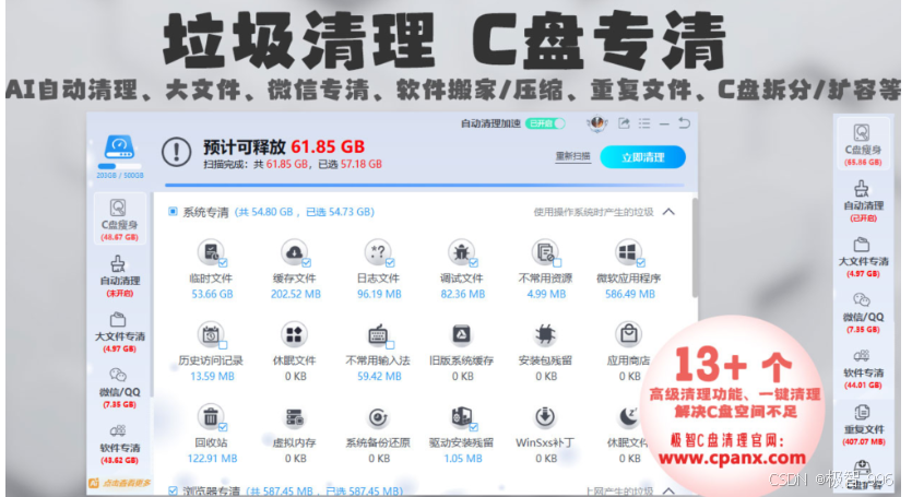 若电脑存在大量的垃圾文件,占用过多的C盘空间,没有足够的磁盘空间让系统正常运行,后续可能仍然会出现开机异常问题,可以点击文章尾部的官网链接卡片 ,前往其官网并使用极智C盘清理软件的C盘清理功能来一键清理缓存垃圾文件,保持系统干净清爽,远离系统卡顿蓝屏。