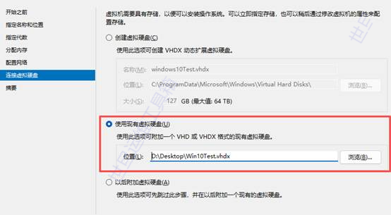 连接虚拟硬盘这里,一定要选择使用现有虚拟硬盘,选中刚刚的VHDX