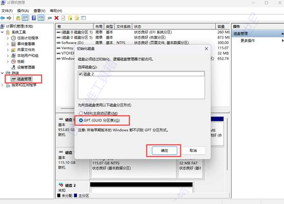 (3)右键此电脑 -- 管理 -- 存储 -- 磁盘管理,这个时候会弹出一个初始化磁盘,就是刚刚挂载的虚拟硬盘,直接初始化为GPT就行