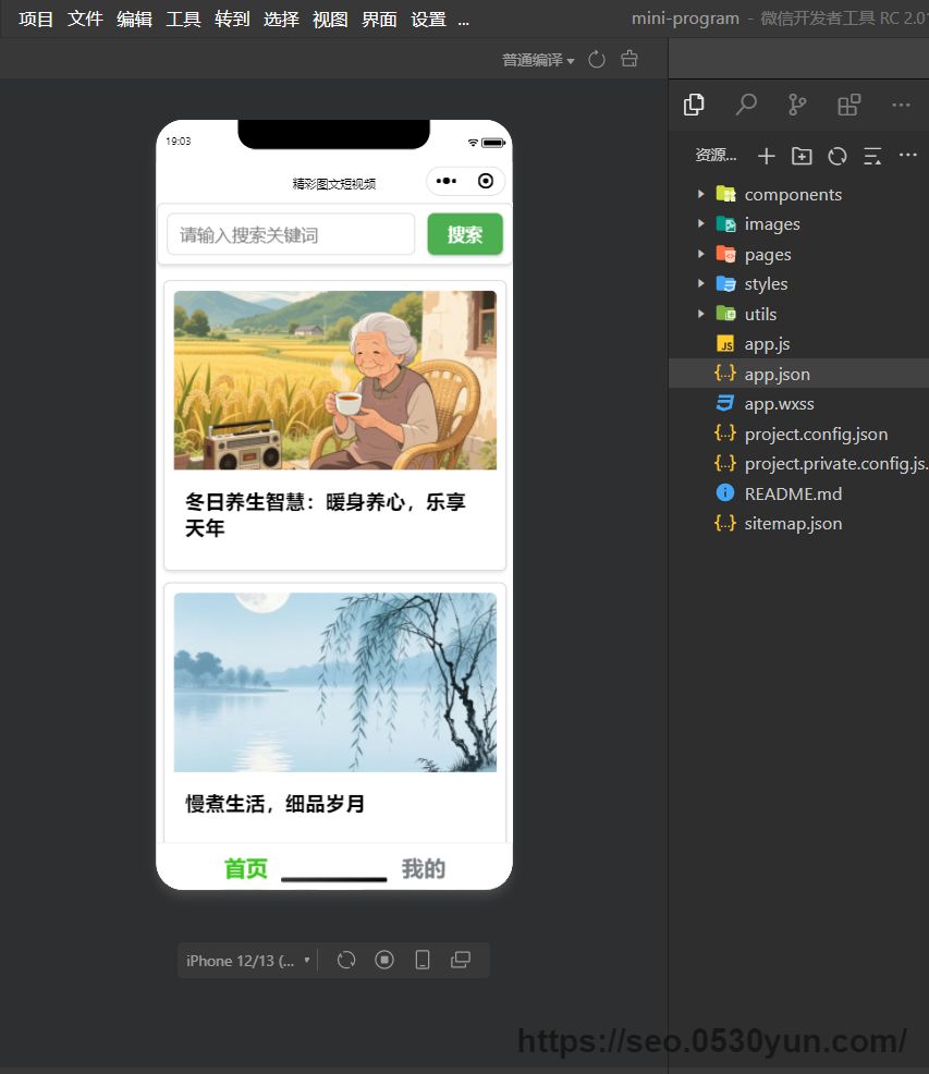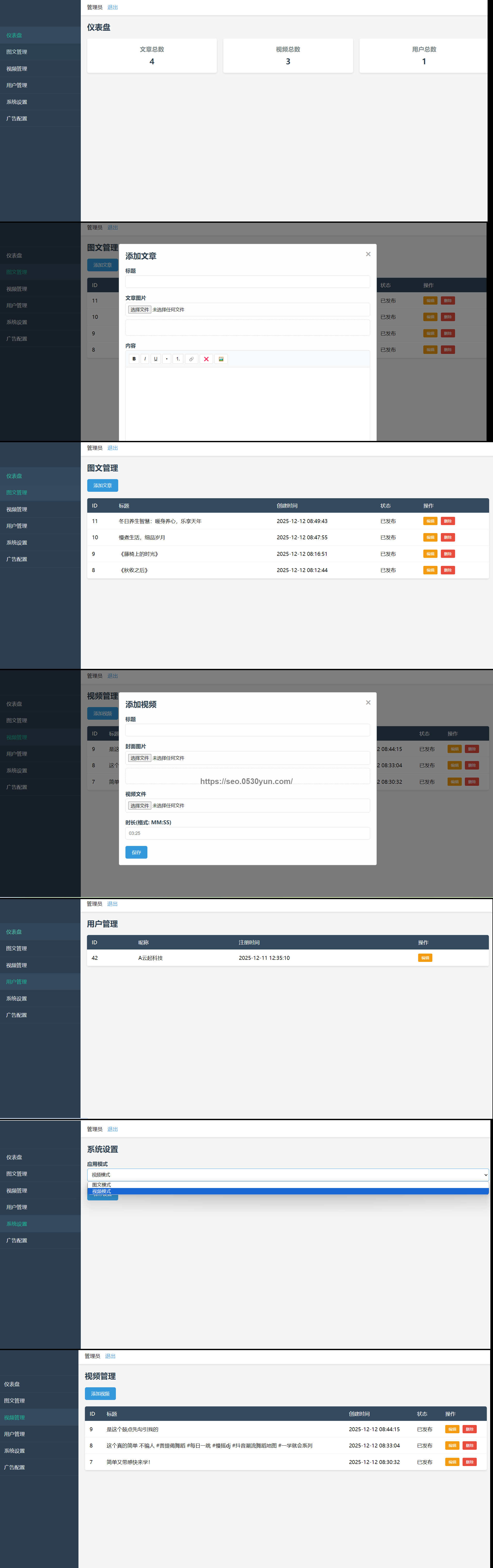 这是一个完整的微信小程序应用,包含前端小程序和后端服务两大部分。主要用于展示和播放图文及短视频内容,用户可以在其中浏览文章、观看视频,并进行互动操作。