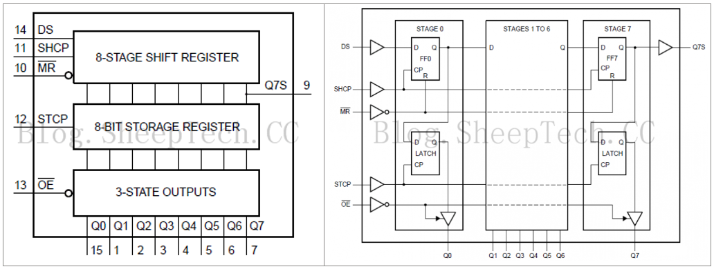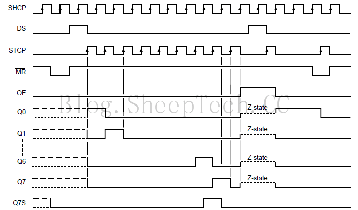 数据DS在移位时钟SHCP的上升沿输入,在SHCP的上升沿进入到存储器中,(高位D7先入,低位D0后入)。