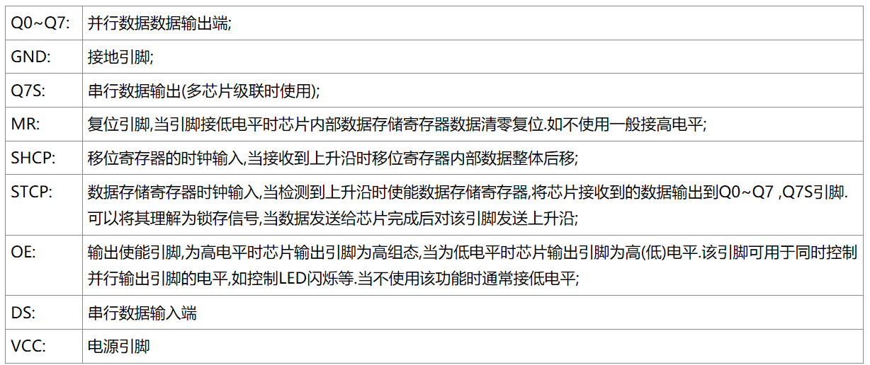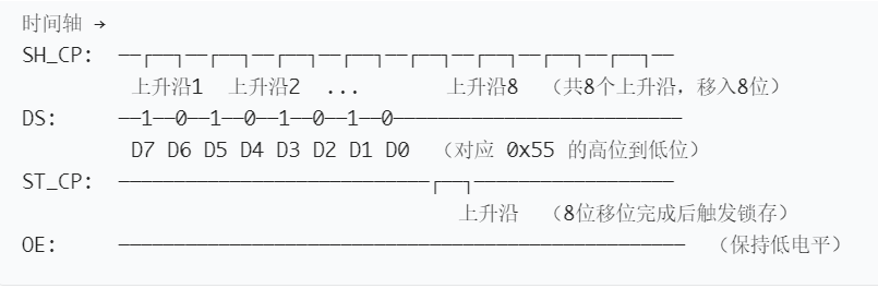 当 8 位数据全部移入后,一个 ST_CP 上升沿会将移位寄存器的数据锁存到输出寄存器,驱动并行引脚输出。