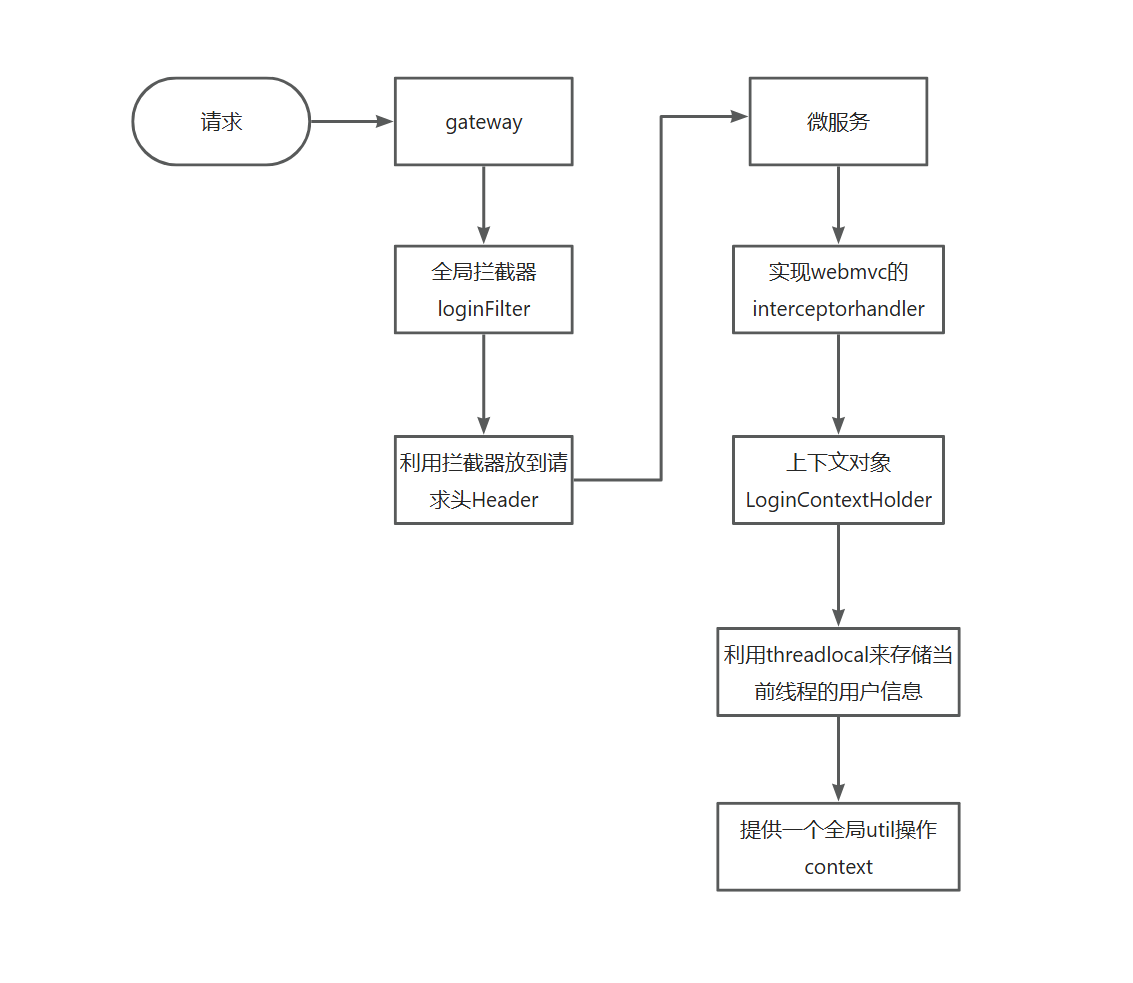 在微服务内部,通过Spring MVC拦截器获取header中的用户信息,并存入ThreadLocal上下文。