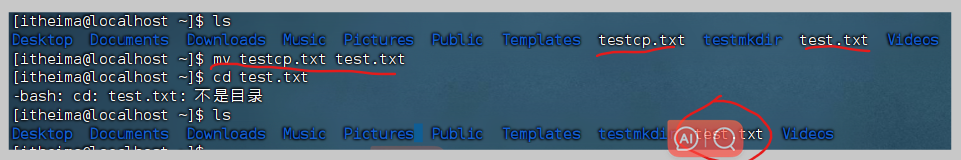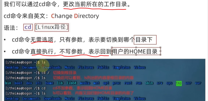 cd:跳转到home目录=cd /home/itheima=cd ~