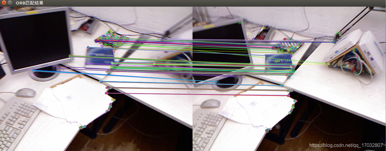 **结论:**EPnP结果非常依赖于特征点的选取及匹配。ORB特征点识别方法理论上是没有什么太大问题的,毕竟目前使用最广的特征点方法的SLAM------ORB_SLAM2方法所采取的特征点识别方法就是ORB识别,但是它用的ORB识别跟OpenCV中使用的ORB识别方法不一样。我们可以看到这个实验所识别到特征点基本集中在一些纹理比较复杂的区域(书和路由器),ORB_SLAM2所使用的是将ORB特征点均匀分布在图像上,并不会产生这样的集中现象。