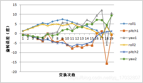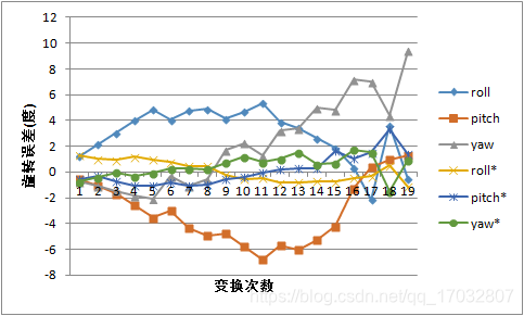 为了对EPnP算法性能有更直观感受,也为了增强一点SLAM算法的实际工程经验,在此,博客将引入数据集的真值与所计算出来的测量值进行比较,并记录产生的误差。对于相机位姿误差,为了能够直观比较,将误差分为旋转误差和平移误差进行比较。同时,由于其真值所包含了实际世界坐标系关于x,y,z方向的定义以及其绝对坐标值,所以实验将会以第一帧的绝对位姿为参考,将所求得的相应R及t之类的相机位姿变换作为改帧的相对变换叠加在第一帧的绝对位姿上,并将其结果与正在测量的改帧的真实值进行比较误差。旋转误差将会折算到我们常用的roll,pitch,yaw欧拉角上进行分别比较,平移误差将会折算到x,y,z三轴上进行分别比较,这样能比较直观地说明问题。实际上,在SLAM系统,初值永远不可能精准,目前这种做法只是为了体验一下算法的优化。