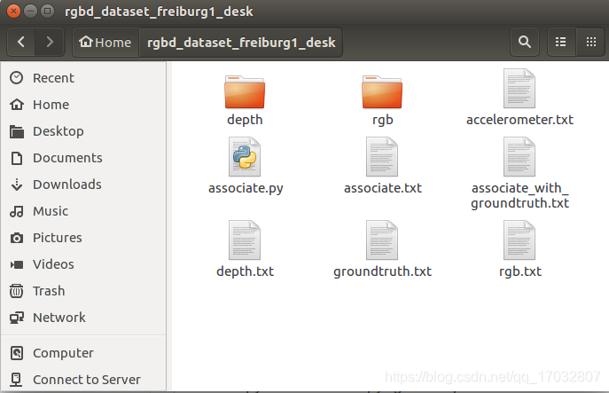数据集下载完成后就如同书中的方法一样,我们需要构建一个txt文件来引导我们的工程来循环读取数据集中的信息。和文中不一样的的是,这次在txt文件中还需要将groundtruth信息添加进去。工具依旧是associate.py,将这个python文件放入下载完成的rgbd_dataset_freiburg1_desk文件夹中,用终端打开这个数据集合文件夹,可以看到用于储存的彩色图像的rgb文件夹和储存深度图像的depth文件夹以及几个引导的txt文件。这时我们开始构建我们需要引导txt文件。