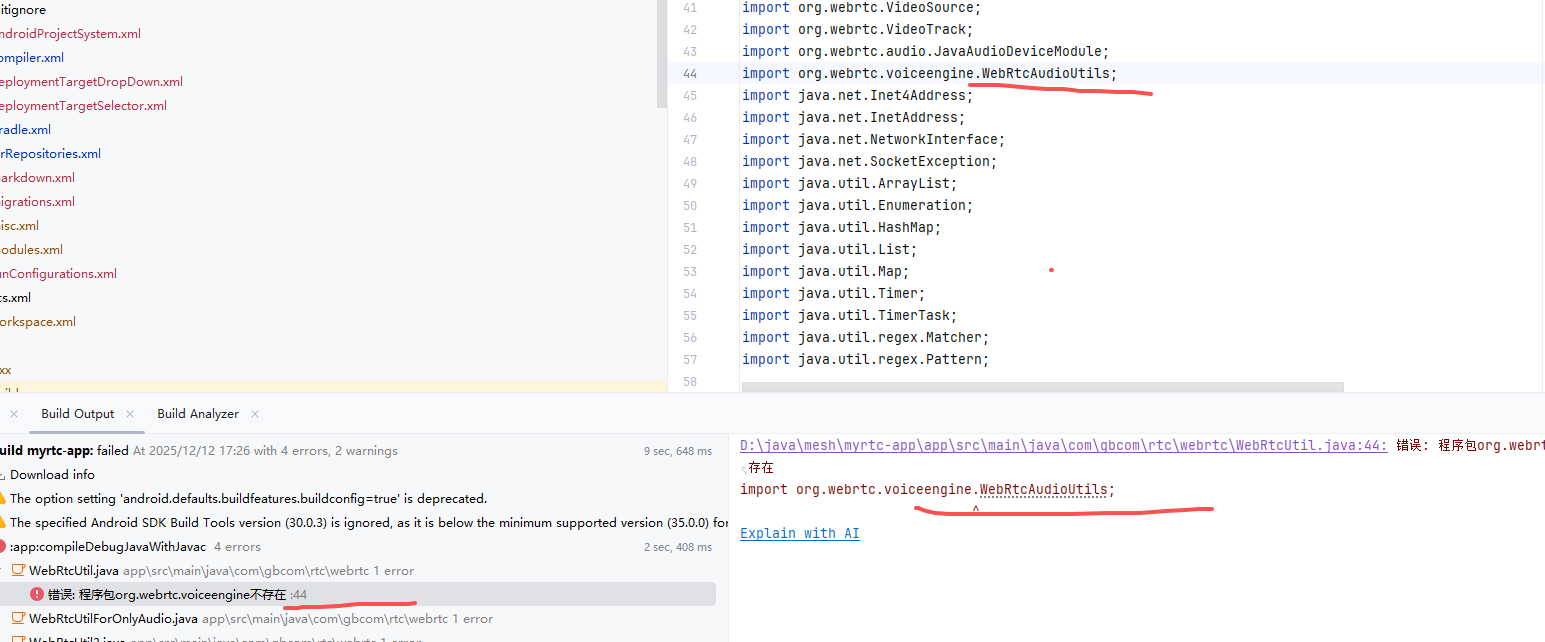 D:\java\mesh\myrtc-app\app\src\main\java\com\gbcom\rtc\webrtc\WebRtcUtil.java:44: 错误: 程序包org.webrtc.voiceengine不存在