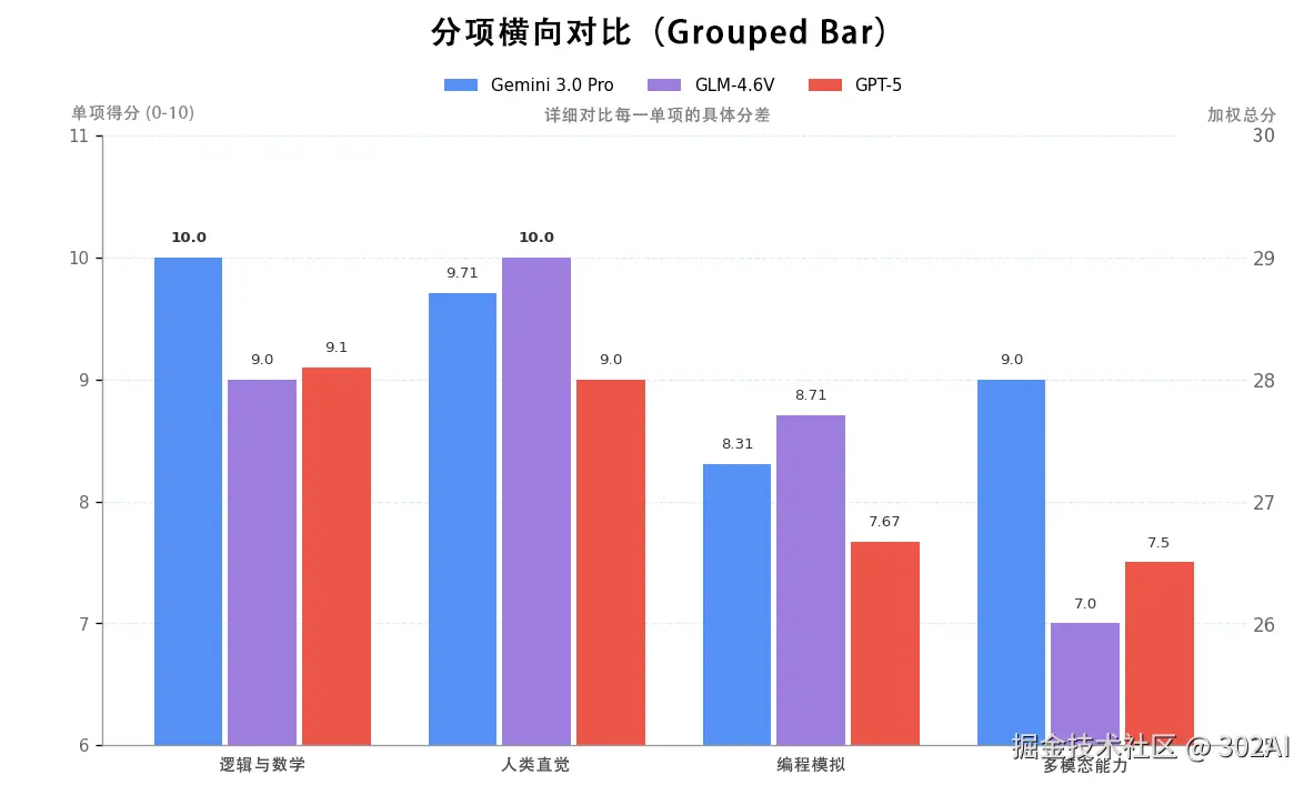 本次测评使用302.AI收录的题库进行独立测试。3款模型分别就逻辑与数学(共10题),人类直觉(共7题),编程模拟(共12题)以及多模态推理(共20题)进行案例测试,对应记分规则取最终结果,下文选取代表性案例进行展示。