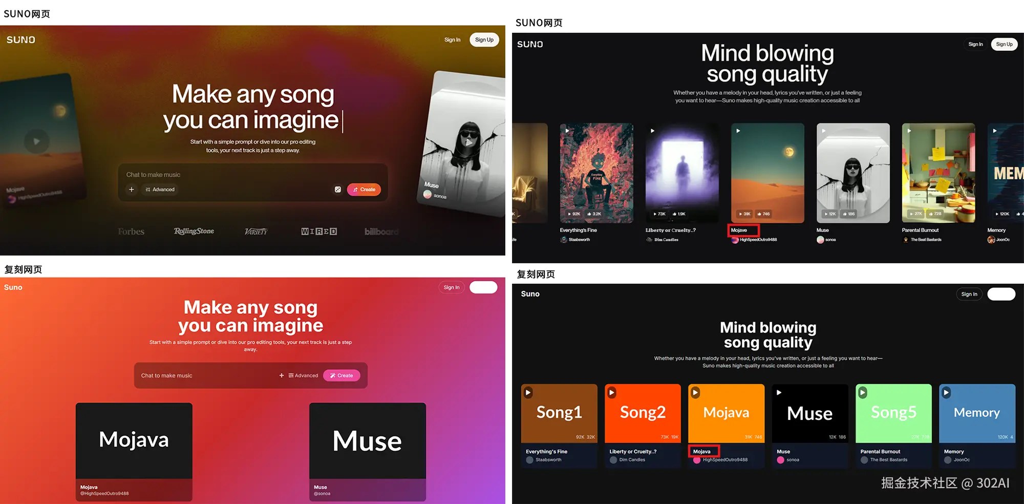 对于这个 Suno 网页的复刻案例,GLM-4.6V 的完成度算中规中矩,抛开复杂的交互逻辑,单从布局和基本内容的视觉还原来讲,并未实现所谓" 像素 级前端复刻" (例如第二页作者名"Mojano"写错为"Mojava"),样式细节也存在偏差(第二页歌曲卡片的播放量位置变为了右下角)等问题