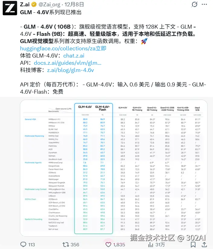 302.AI 现已接入 GML-4.6V 系列模型 API,本期实测将针对 GLM-4.6V 展开多维度的实测对比,直观感受其在多模态任务中的实际应用表现。