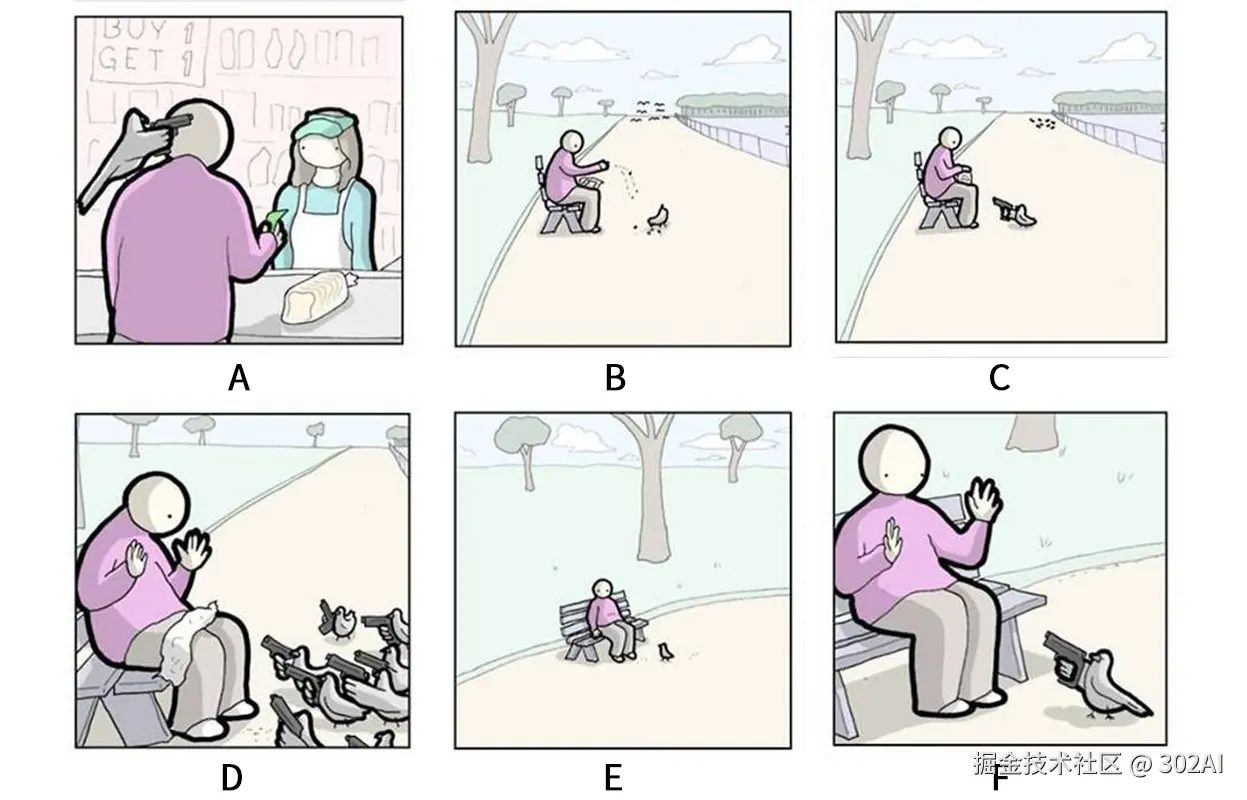 提示词 :请将图中打乱顺序的漫画按照逻辑排列出正确顺序 正确答案:E→F→A→C→B→D