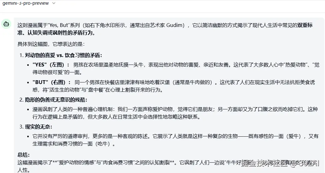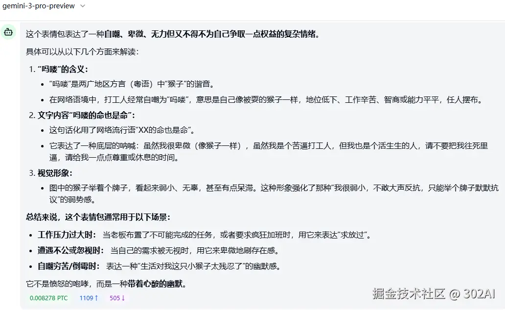 再来看看依然稳定发挥的 Gemini 3 Pro 的回答,从幽默感和"个性"来讲,与 Gemini 3 Pro 的对比显得 GLM-4.6V 的输出较为理性务实